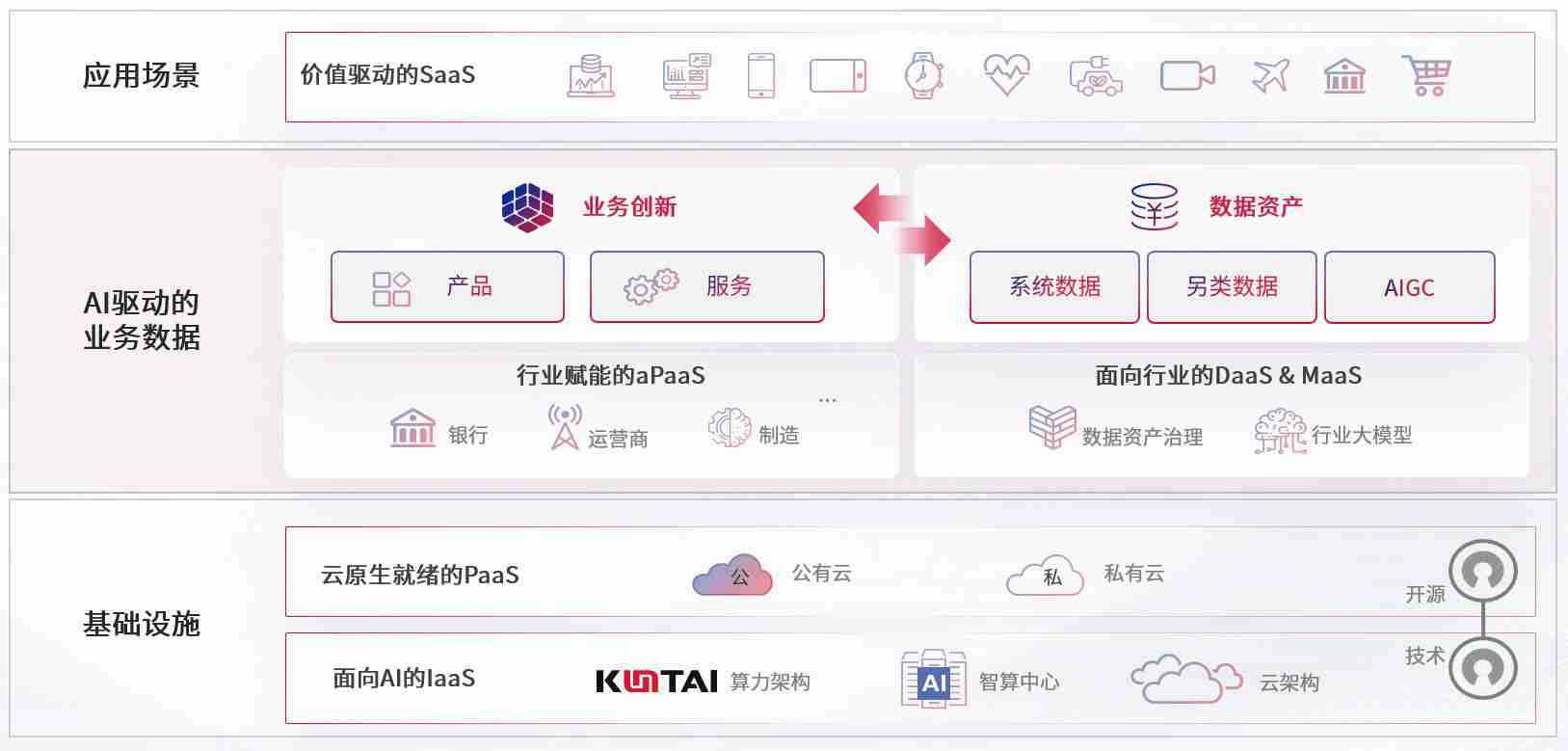在基础设施层面,,,,基于商业或开源的云原生就绪开发工具与技术组件(PaaS)和面向AI的底层公共基础设施资源(IaaS),,,,将共同支撑企业完成数字化转型
